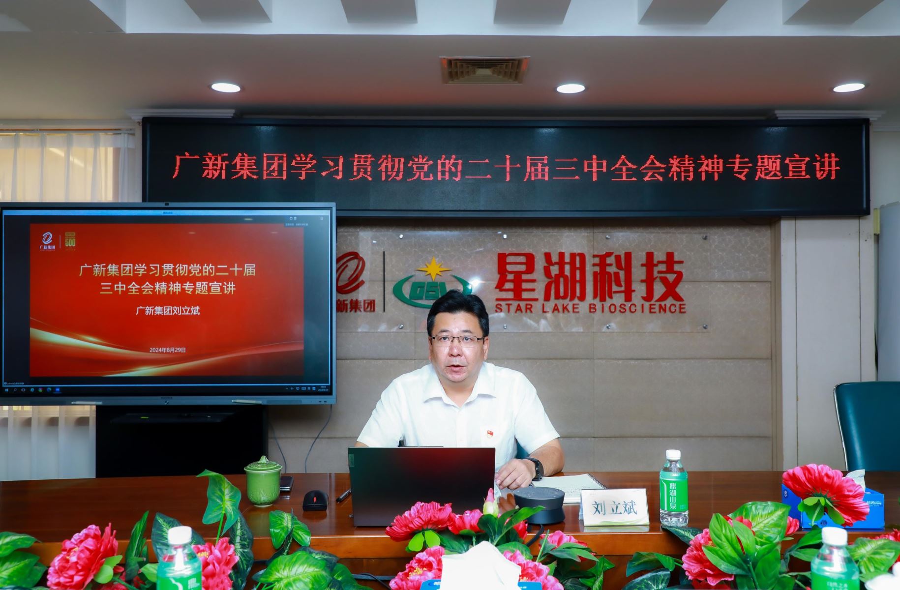 為深入學(xué)習(xí)貫徹習(xí)近平總書記在黨的二十屆三中全會上的重要講話精神和全會精神,推動全會精神貫徹落實,8月29日下午,廣新集團黨委委員、副總經(jīng)理劉立斌到星湖科技專題宣講黨的二十屆三中全會精神。星湖科技領(lǐng)導(dǎo)班子、專項工作負(fù)責(zé)人、中層副職及以上管理人員,下屬企業(yè)領(lǐng)導(dǎo)班子及中層管理人員共140多人參加會議,星湖科技黨委書記陳武主持會議。